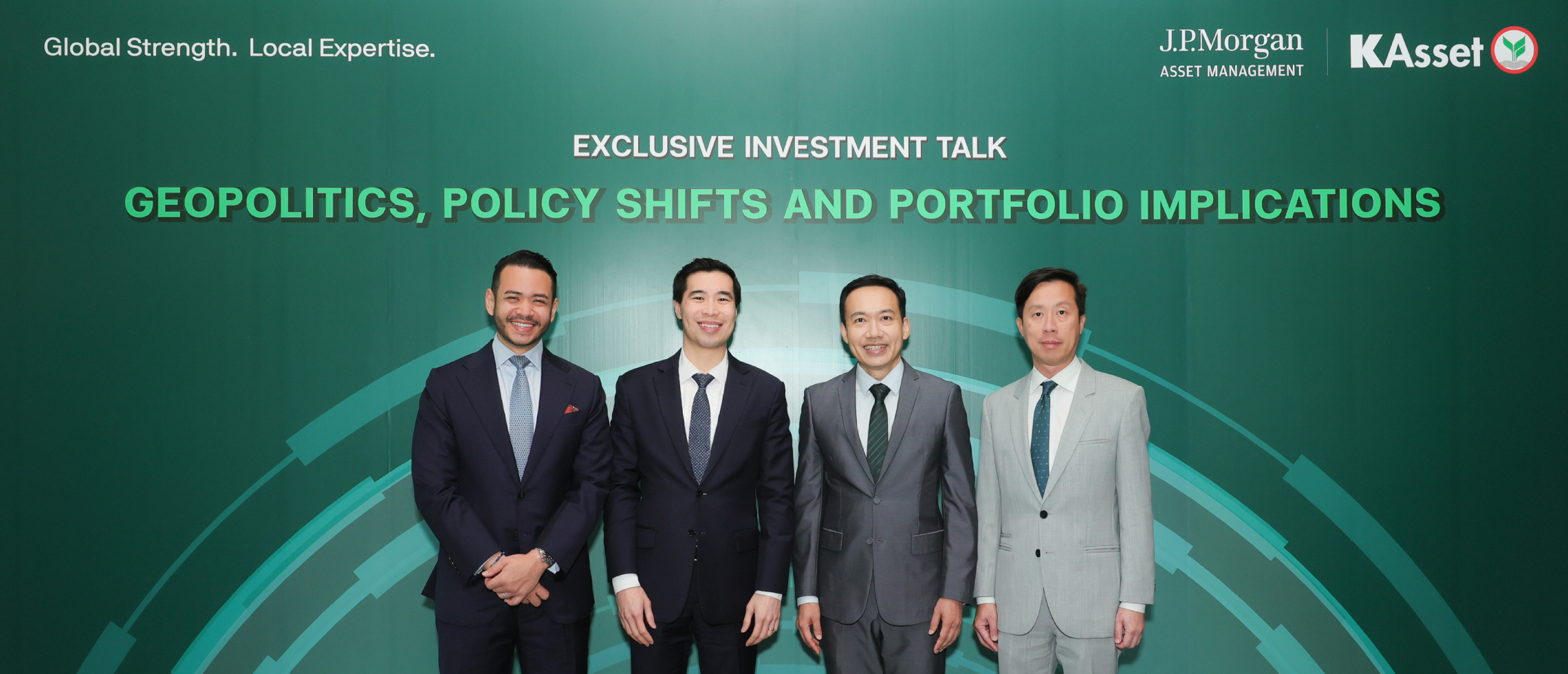 บริษัทหลักทรัพย์จัดการกองทุน กสิกรไทย จำกัด (บลจ.กสิกรไทย) ร่วมกับ J.P. Morgan Asset Management (JPMAM) จัดงานสัมมนา Exclusive Investment Talk: Geopolitics, Policy Shifts and Portfolio Implications โดยเนื้อหาการเสวนามุ่งสะท้อนภาพใหญ่ของโลกในมุมมองของผู้เชี่ยวชาญด้านนโยบายการเงิน ซึ่งครอบคลุมประเด็นสำคัญ อาทิ ผลกระทบจากความขัดแย้งในตะวันออกกลาง ความไม่แน่นอนทางด้านภูมิรัฐศาสตร์ และทิศทางนโยบายการเงิน พร้อมเชื่อมโยงสู่กรอบการจัดพอร์ตอย่างเป็นระบบ โดยได้รับเกียรติจากนายวิน พรหมแพทย์, CFA (ที่ 2 จากขวา) ประธานกรรมการบริหาร บลจ.กสิกรไทย และ Mr. Geng Ngarmboonanant (ที่ 2 จากซ้าย) Deputy Head of Research and Head of Macro and Policy, Multi-Asset Solutions, JPMAM ณ โรงแรม แอนดาซ วัน แบงค็อก กรุงเทพฯ เมื่อเร็วๆ นี้
