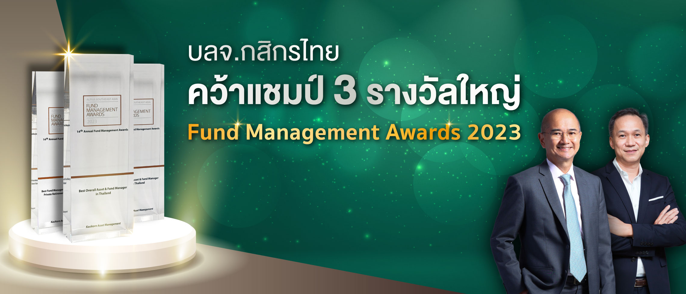 บริษัทหลักทรัพย์จัดการกองทุน กสิกรไทย จำกัด (บลจ.กสิกรไทย) คว้า 3 รางวัลแชมป์จากงาน 14th Annual Fund Management Awards 2023 อันประกอบไปด้วยรางวัล Best Overall Asset & Fund Manager รางวัล Best Online & Mobile Platform (Asset Manager) ติดต่อกัน 2 ปีซ้อน และรางวัล Best Fund Manager for Pension Mandates & Private Retirement Schemes จัดโดย Alpha Southeast Asia นิตยสารชั้นนำด้านการลงทุนในภูมิภาคเอเชียตะวันออกเฉียงใต้ ทั้งนี้ รางวัลทั้ง 3 ได้สะท้อนถึงการบริหารจัดการกองทุนอย่างมั่นคง โปร่งใส ภายใต้การบริหารความเสี่ยงที่เหมาะสม และมีความมุ่งมั่นพัฒนาโซลูชั่นที่หลากหลายครอบคลุมทุกความต้องการเพื่อครองใจลูกค้า นับเป็นการการันตีถึงความครบเครื่องเรื่องการลงทุนภายใต้แนวคิด Top of Mind Investment House โดยมีนายอดิศร เสริมชัยวงศ์ ประธานกรรมการบริหาร บลจ.กสิกรไทย (ซ้าย) และนายสุรเดช เกียรติธนากร กรรมการผู้จัดการ บลจ.กสิกรไทย (ขวา) ร่วมยินดีกับความสำเร็จในครั้งนี้